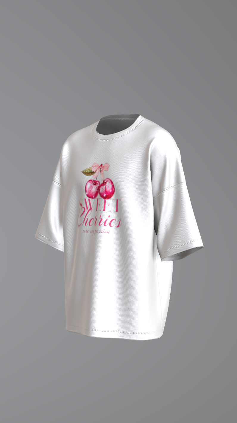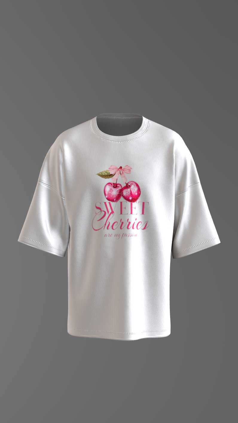 Add a cute and trendy vibe to your wardrobe with this Sweet Cherries White Oversized T-Shirt for Girls. Designed with a soft pastel cherry graphic and elegant typography, this t-shirt brings a fresh, playful, and feminine streetwear aesthetic. Made from premium-quality breathable cotton fabric, it offers unmatched comfort and a relaxed oversized fit perfect for everyday wear.